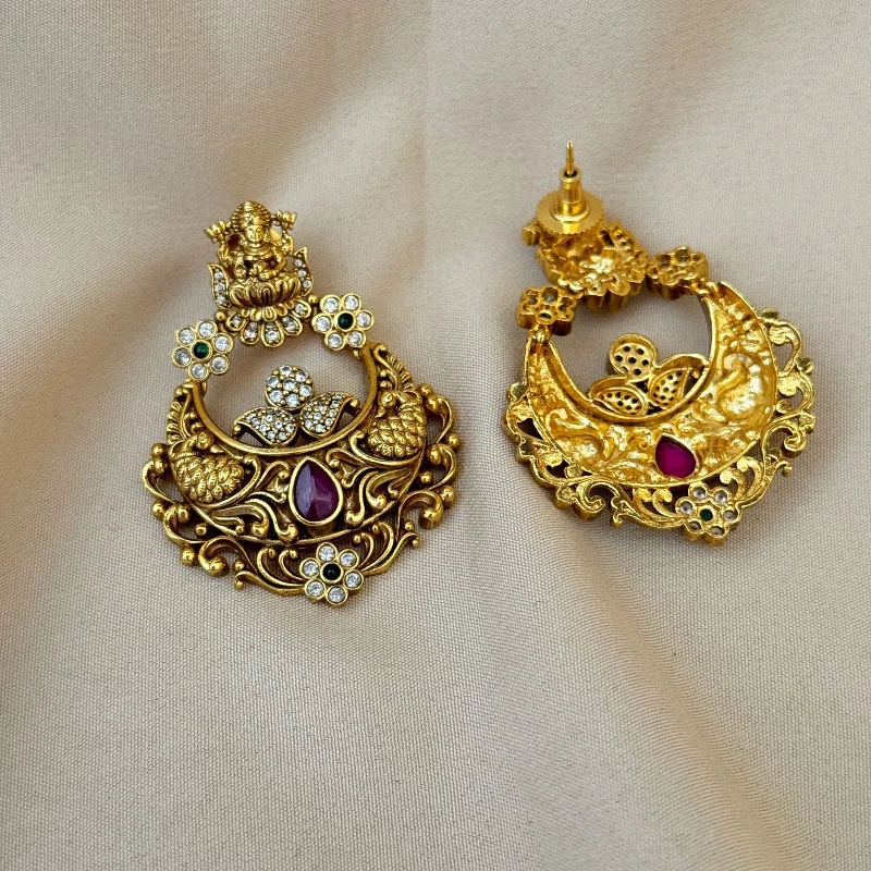 Adorned with a breathtaking selection of Zircon AD our Antique Earrings exude luxury and opulence. Each stone is carefully chosen for its exceptional quality and brilliance, effortlessly adding a touch of sparkle and glamor to every Earrings. Notably, whether it’s the fiery red of the rubies, the lush green of the emeralds, or the dazzling clarity of the zircon AD stones, each gemstone complements the antique gold finish perfectly, creating a captivating contrast that effortlessly catches the eye.