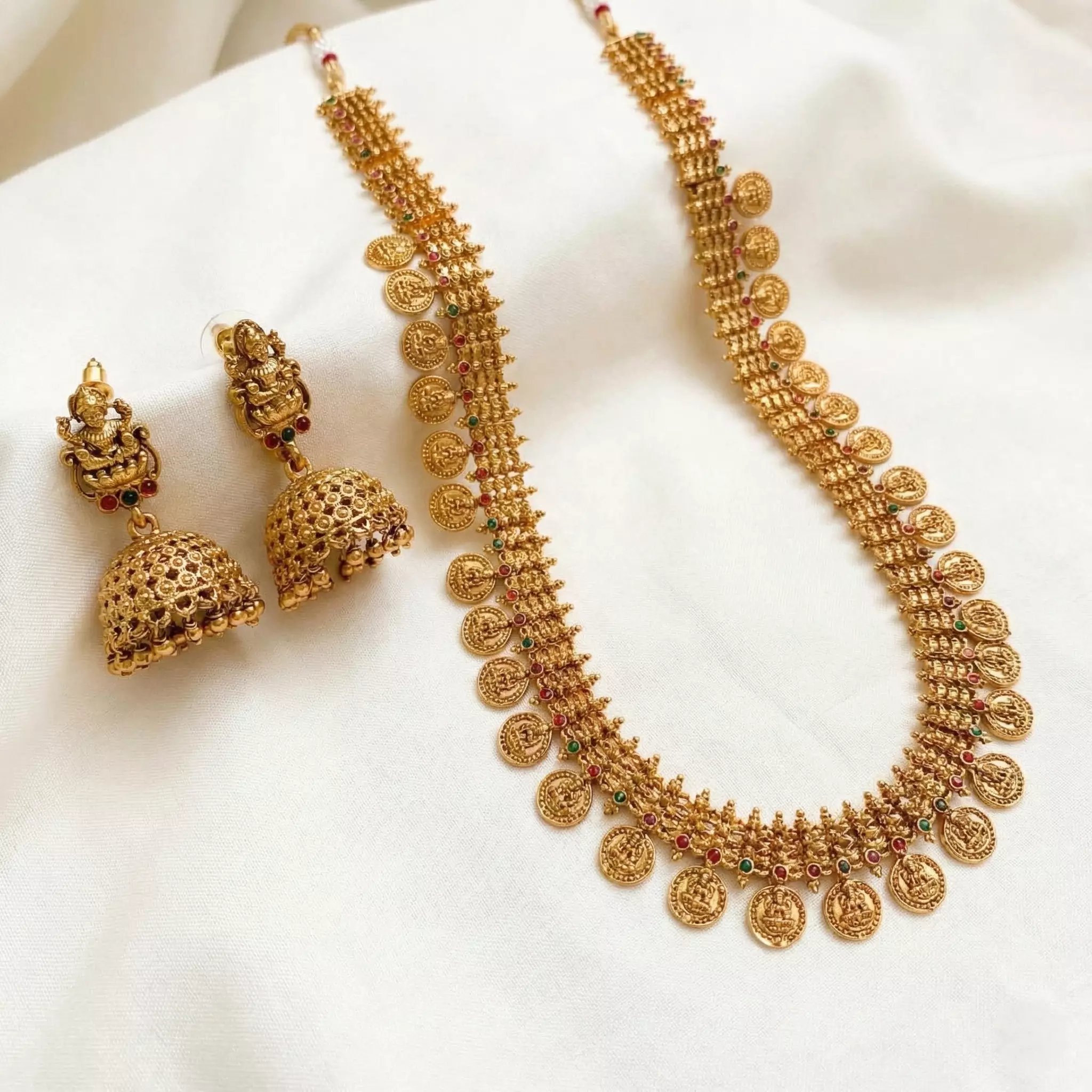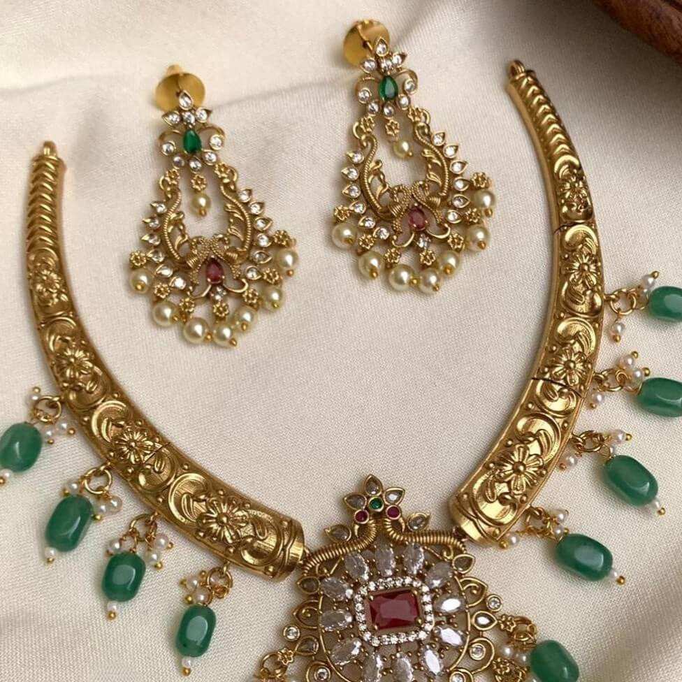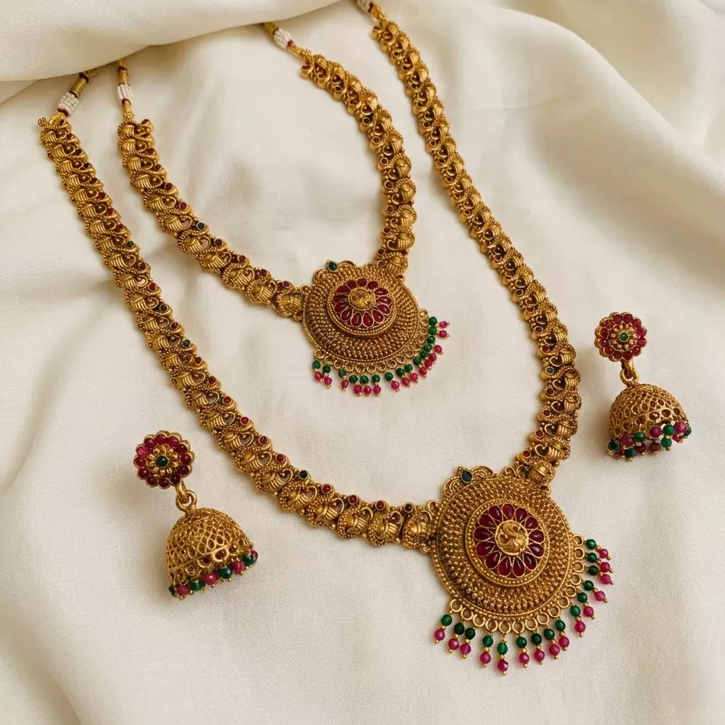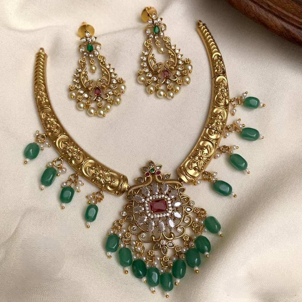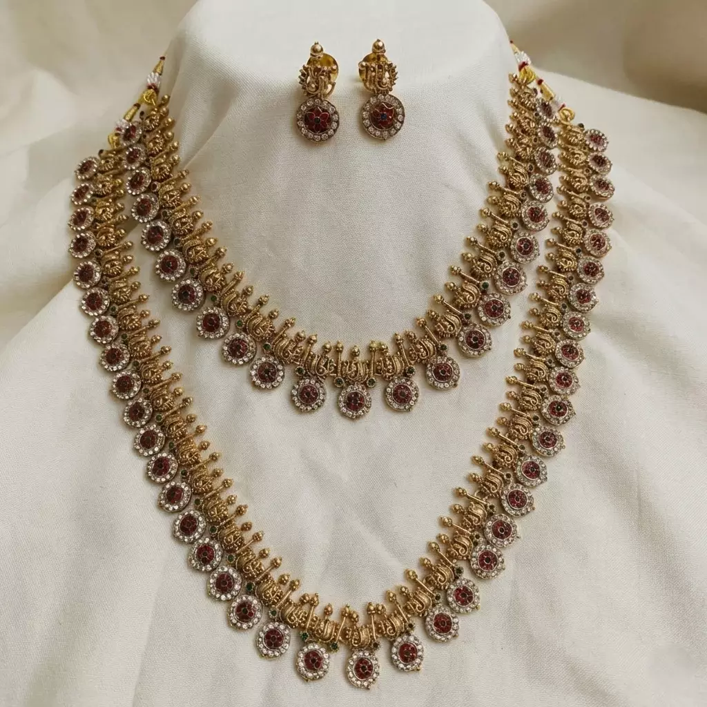 Paired with matching earrings, this set is perfect for bridal wear, festive celebrations, and special occasions.