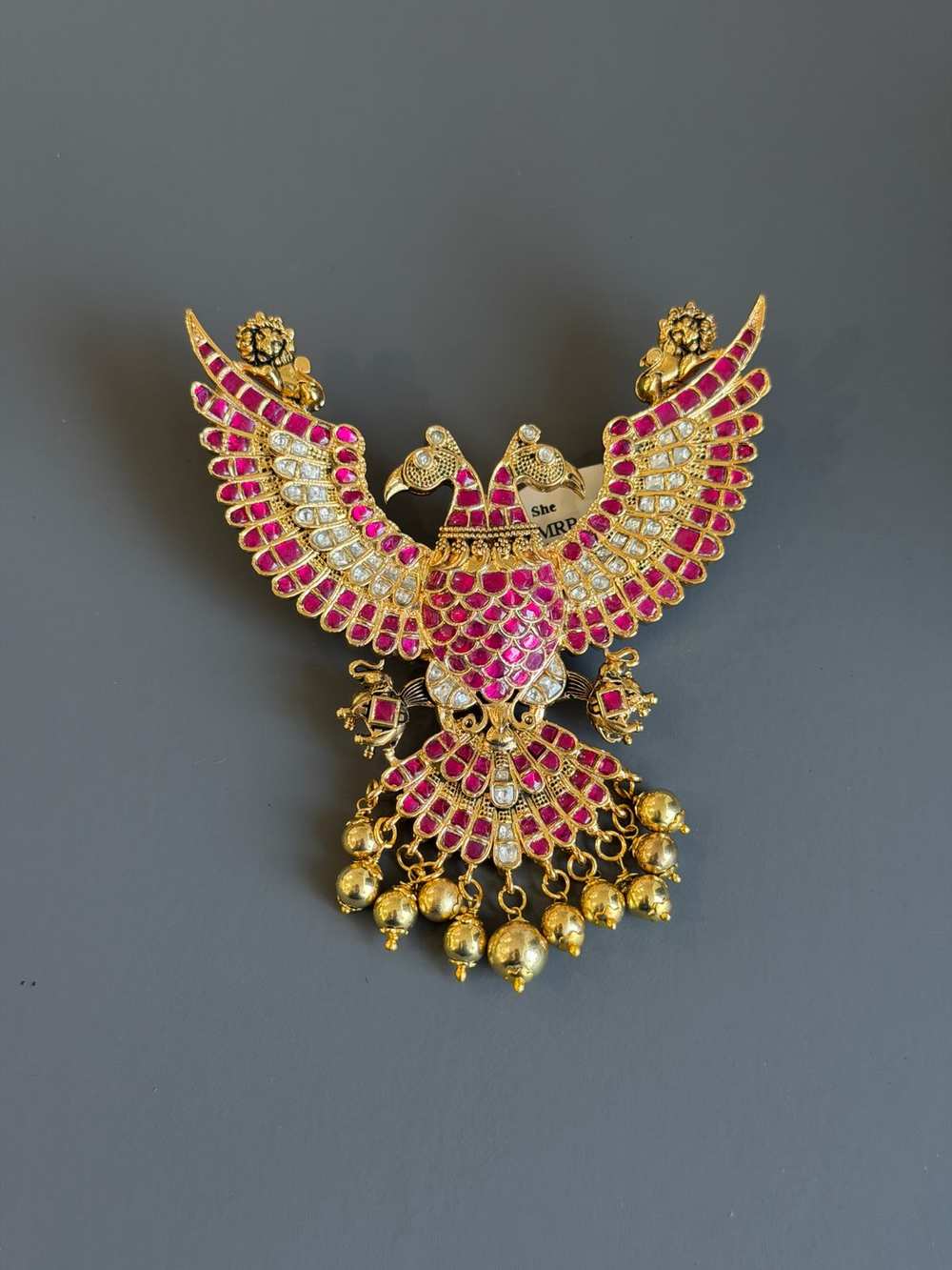 Elegant traditional pendant crafted in brass with vibrant red, green, and white stones. Perfect for festive and ethnic wear, adding a rich and graceful touch to your look.