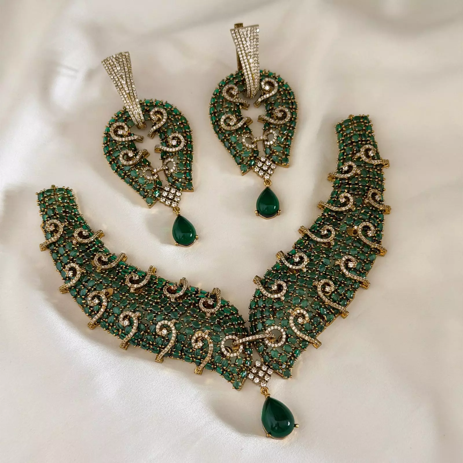 This necklace for the bride on her wedding day is a beautiful blend of antique and traditional designs. It’s a perfect bridal necklace for women who appreciate the charm of vintage jewelry. The emerald accents add a unique touch, making it a standout piece.